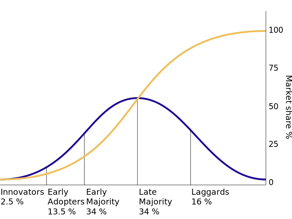 It got me thinking about how ideas spread and the innovation adoption curve, developed by the sociologist Everett M. Rogers and based on wide-ranging studies of innovation adoption. The blue represents categories of adopters, and the yellow overall market share.