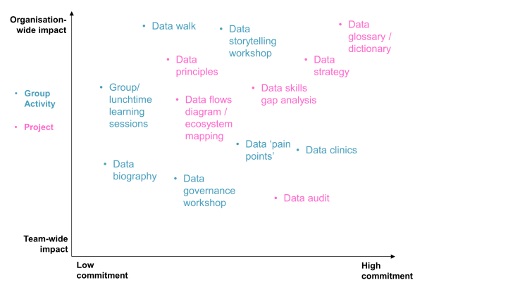 I’ve pulled together a list of 5 group activities and 6 longer term projects that will help foster a positive data culture by changing behaviour. I’ve mapped them below (in a completely subjective way, and broadly based upon my own experiences!). Please do get in touch if you want to discuss these approaches in more detail.