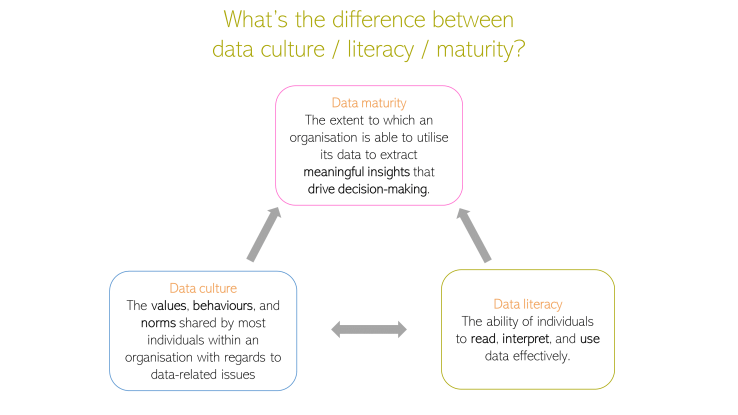 In my opinion, data culture and data literacy are quite closely linked and that they both likely determine how data mature an organisation is (that is, the extent to which decisions are based upon meaningful data insights).