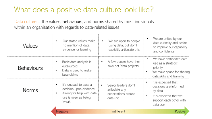 - When we say data culture, we implicitly mean a positive data culture, but that actually organisational cultures exist on a spectrum and data cultures are no different. A negative data culture isn’t simply the absence of one. An organisation’s data culture is a symptom of its wider learning culture, value sets, and norms. If we don’t discuss what a negative and positive data culture looks like, we won’t be able to identify why people feel like they can’t say they don’t understand the data they’re seeing, or suggest that a service improvement is made based upon the evidence. It’s important to recognise that both negative and positive data cultures exist.